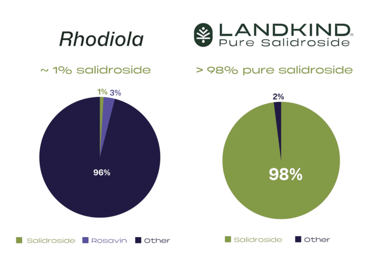 Unlike conventional Rhodiola extracts, which contain variable levels of rosavins, plant matrix compounds, and unidentified by-products, LANDKIND® focuses solely on salidroside—the most recognized molecule responsible for Rhodiola’s adaptogenic effects.
